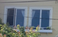 You know how it goes. You start one “little” house project and there are all sorts of others that MUST be done as a result. Soooo, while we were prepping the house to be painted I brought up the fact (probably for the 42nd time) that the front windows just seemed a bit “odd looking”. Although they were two separate windows they were seemingly connected by a single piece of wood on both top and bottom that ran the width (or, is it “length”?) of both windows. Not the clearest of pictures but you can see (around all the city electrical wires) in the pics below.