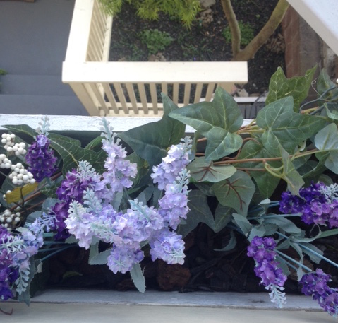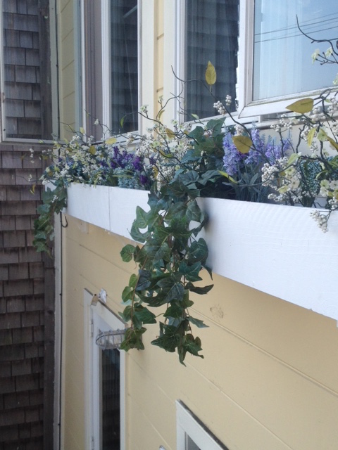 Finally, I look at the window boxes from the living room windows, and realize that anyone looking at them from inside the house would definetly know they were artificial flowers. You could totally see the styrofoam. This shot is looking straight down on the flower box where you can pretty easily see the white styrofoam……