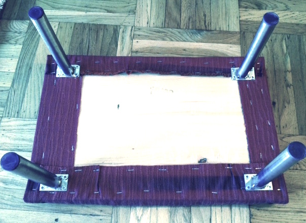 So, now I had the top to the bench (old cutting board), the top cushion (foam), and the legs for the bench. All from simply rummaging through our left over stuff. I was on a role with the whole “re-purposing” concept.